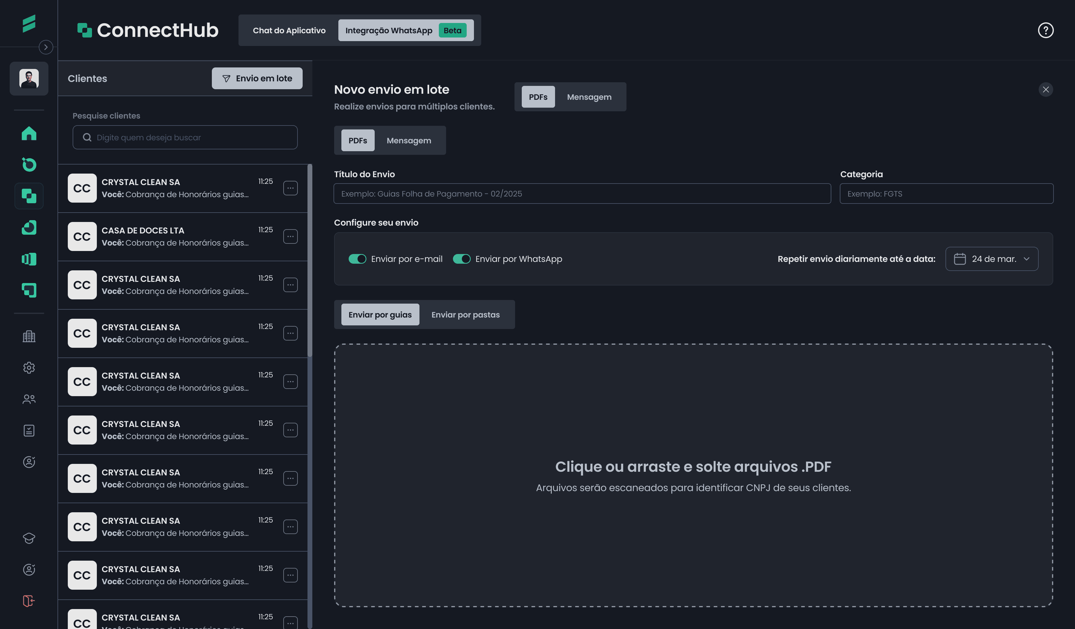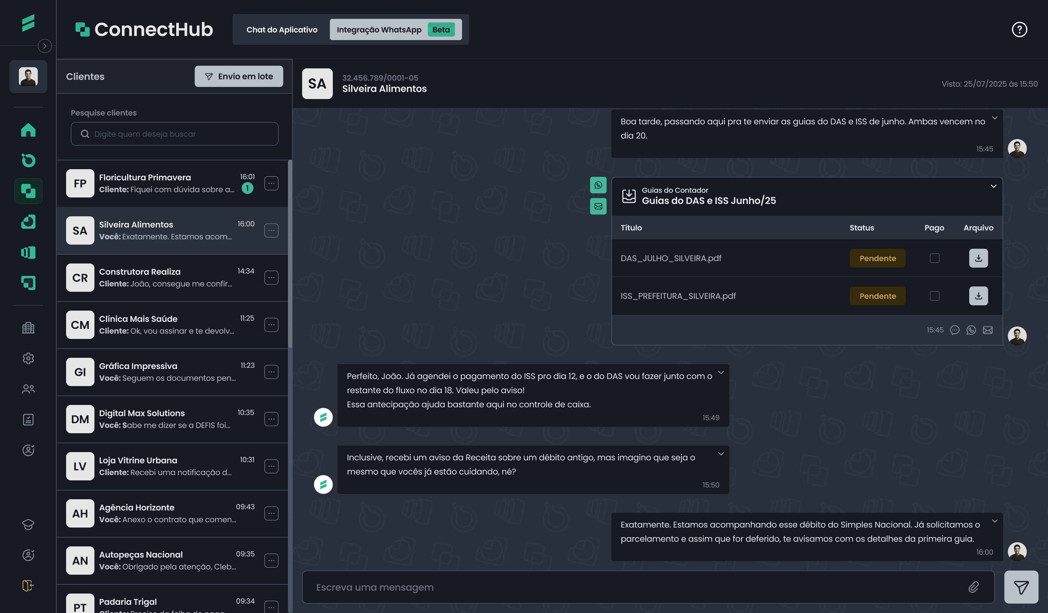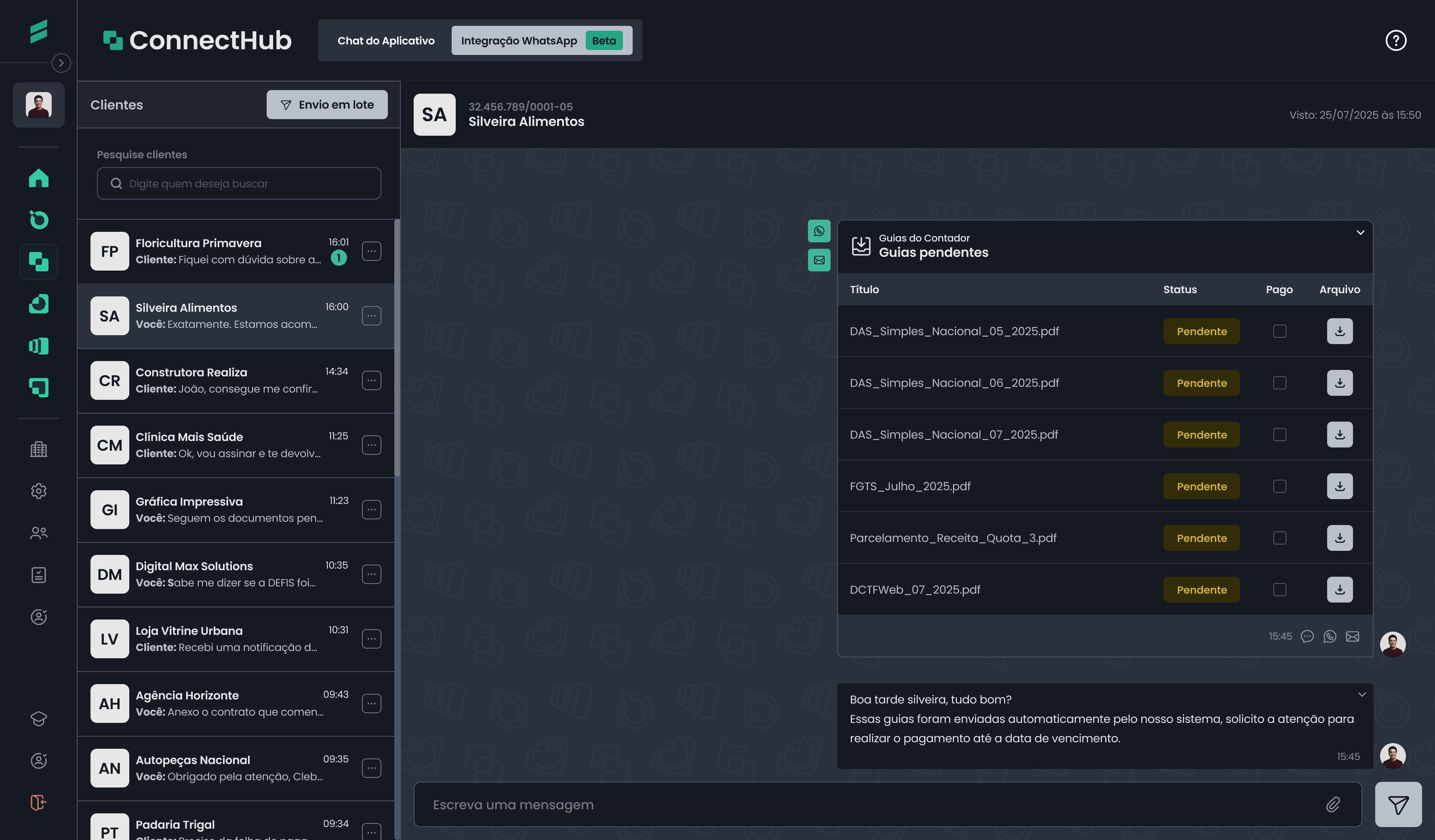 Tenha uma visão clara de como o ConnectHub organiza a comunicação com seus clientes e automatiza o envio de mensagens e documentos do seu escritório.