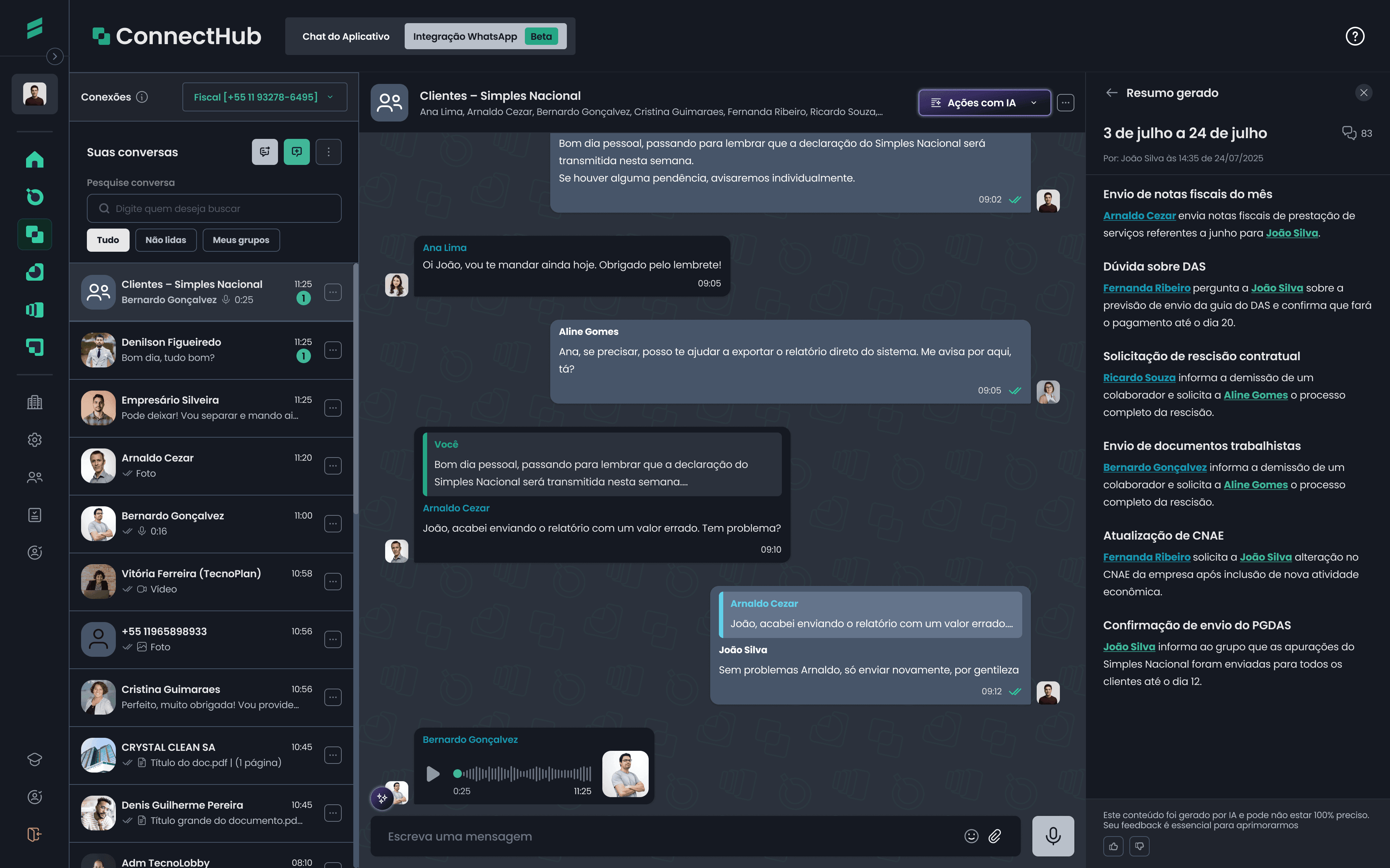 Não deu tempo de acompanhar tudo? A IA do ConnectHub analisa e gera resumos das mensagens não lidas, para que você entenda o contexto rapidamente e responda com mais assertividade.