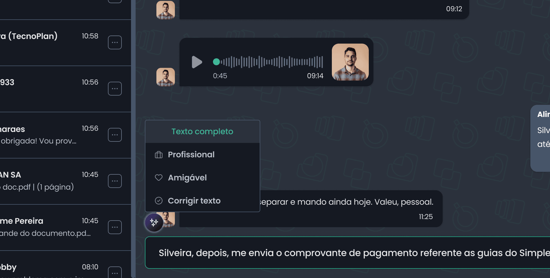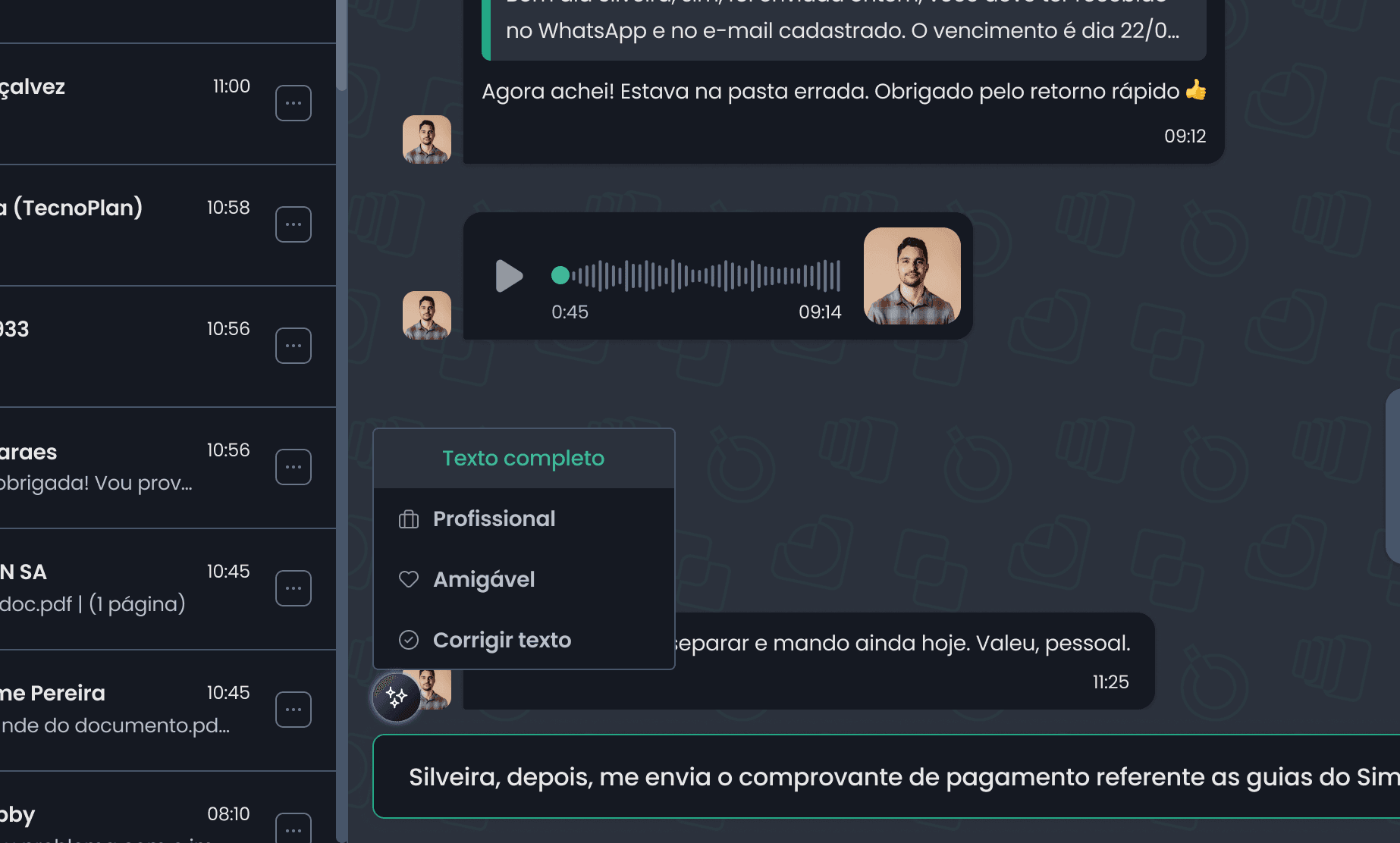 Antes de enviar uma mensagem, você pode revisar o texto com sugestões de tom, clareza e abordagem, garantindo uma comunicação mais humana, empática e eficaz com o cliente.