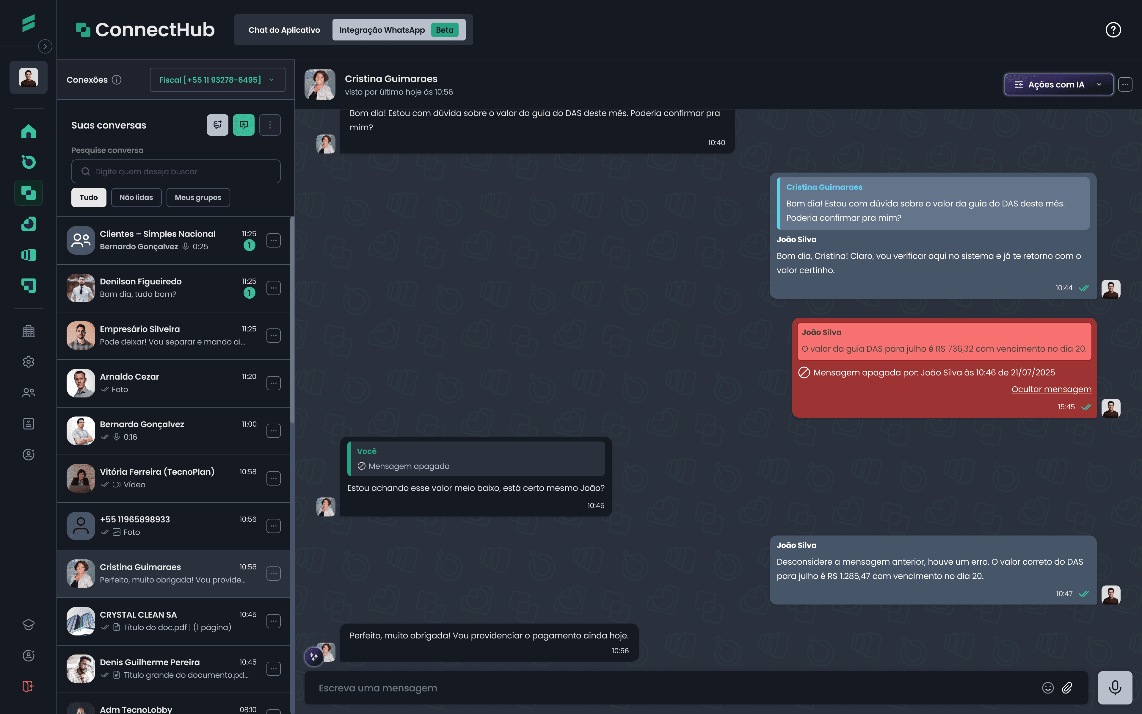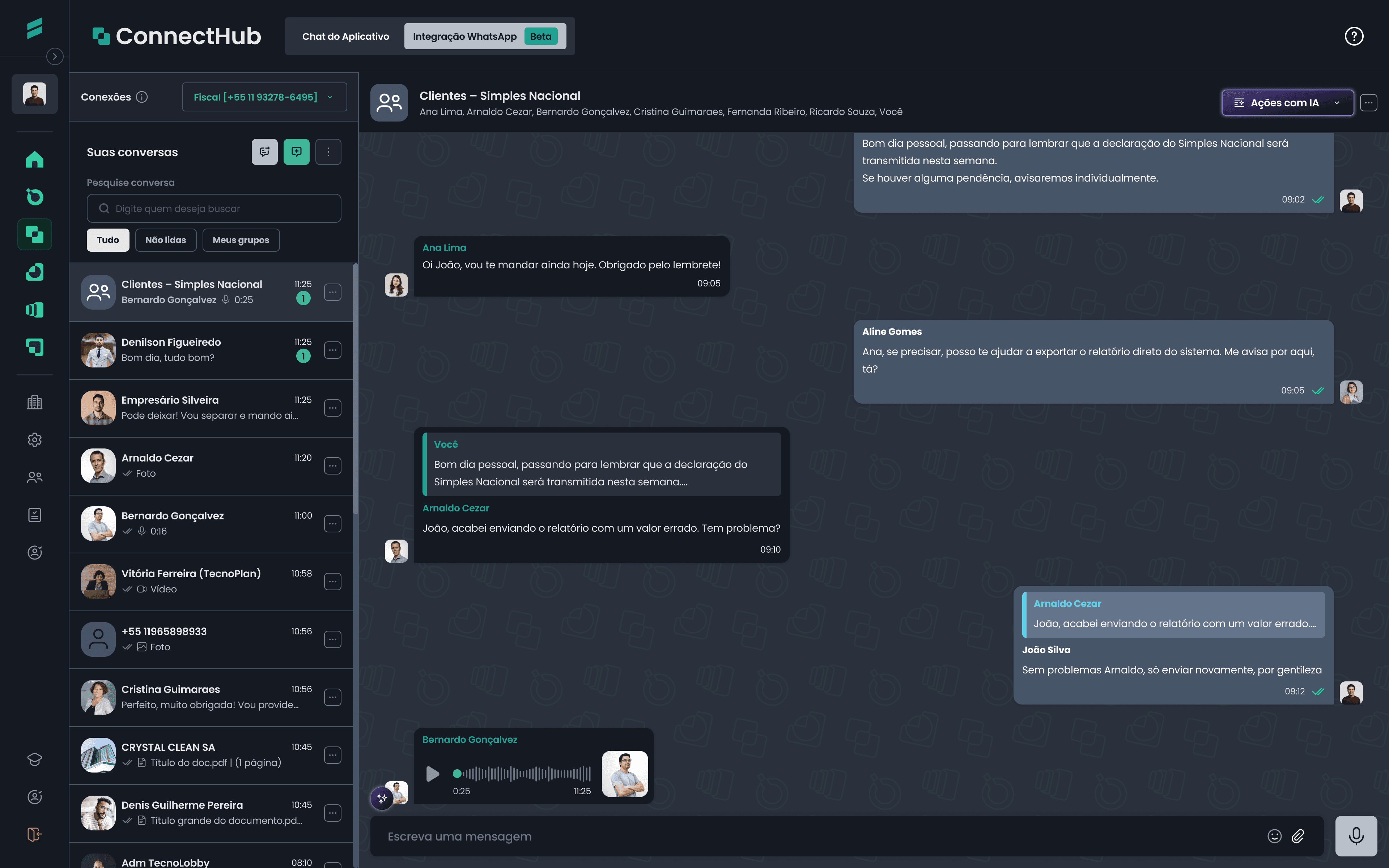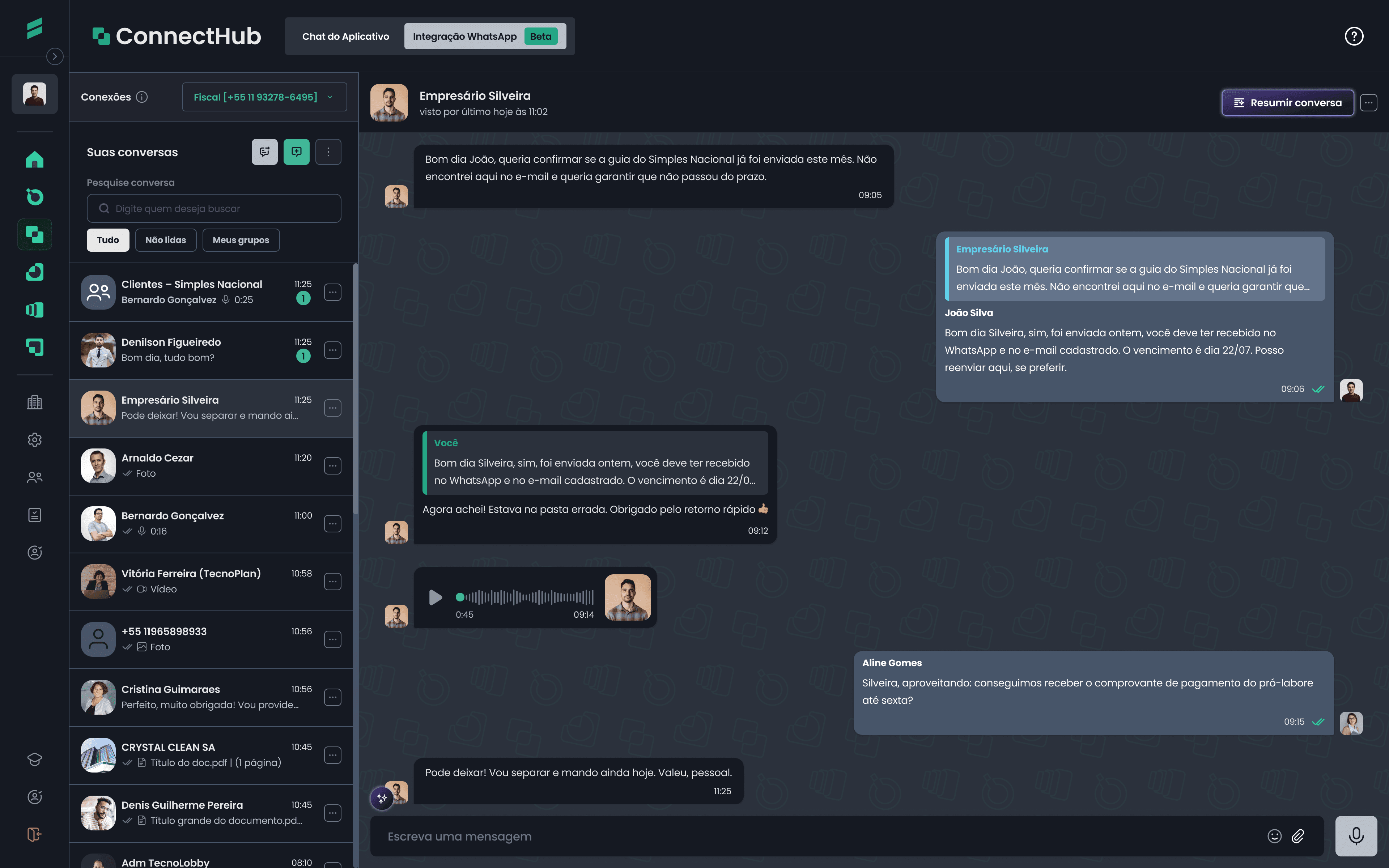 Com a integração WhatsApp, você conversa diretamente com os clientes dentro do ConnectHub. Tudo sincronizado com o número do escritório e com total controle da comunicação.