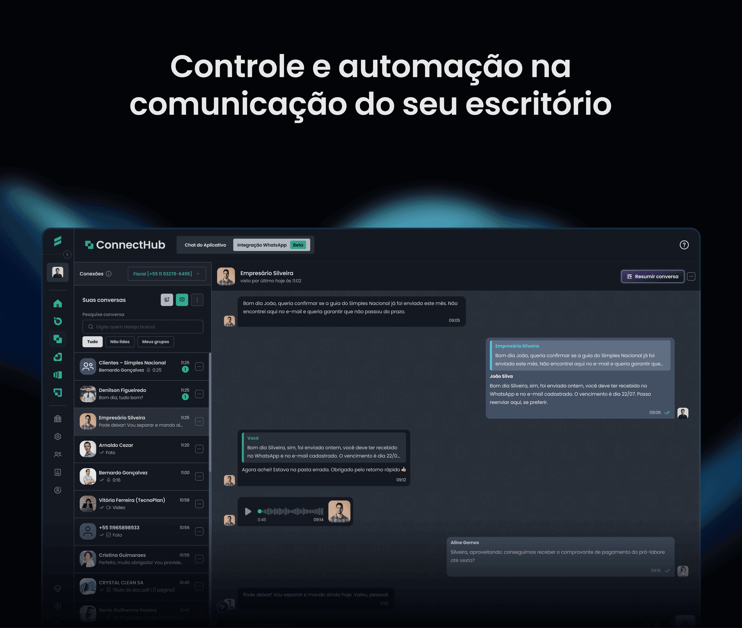 Centralize, automatize e proteja o WhatsApp da sua contabilidade. Envios automáticos, controle de qualidade com IA e segurança das conversas em tempo real.